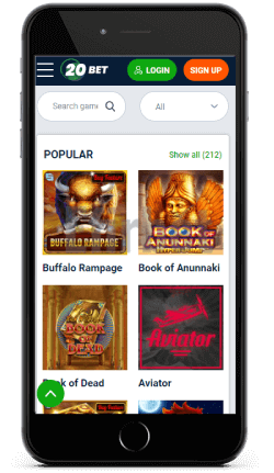- Συμβατότητα με Πολλαπλές Συσκευές. Η έκδοση για κινητά του 20Bet Casino είναι συμβατή με Android και iOS συσκευές, προσφέροντας πρόσβαση σε μια μεγάλη γκάμα παιχνιδιών χωρίς την ανάγκη λήψης εφαρμογής.