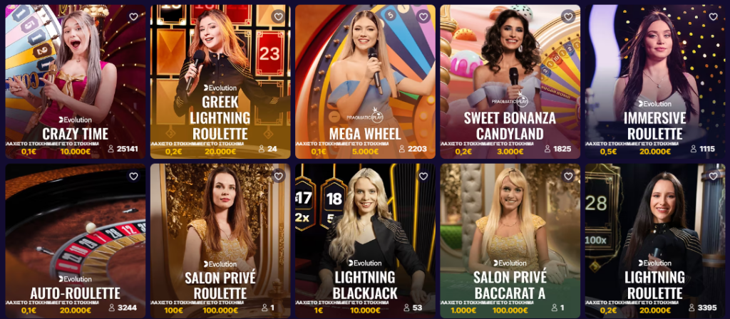 - Ζωντανά Παιχνίδια (Live Games). Πρόσβαση σε ζωντανά παιχνίδια καζίνο με πραγματικούς κρουπιέρηδες. Ζωντανή ρουλέτα, μπλάκτζακ, μπακαρά και άλλα δημοφιλή παιχνίδια.