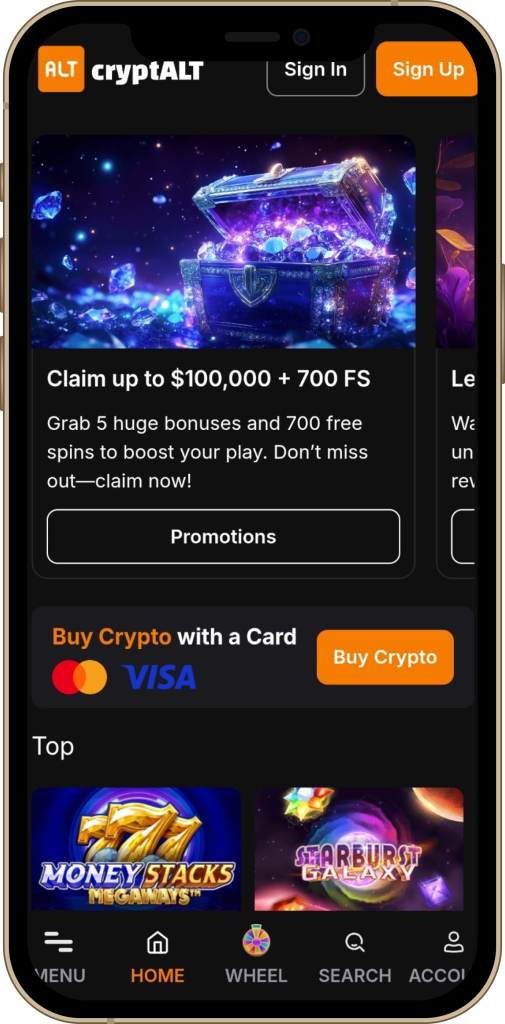 Το Cryptalt Casino είναι πλήρως βελτιστοποιημένο για χρήση από κινητά και tablet, προσφέροντας ομαλή εμπειρία παιχνιδιού χωρίς την ανάγκη εγκατάστασης εφαρμογής. Η πλατφόρμα έχει σχεδιαστεί με γνώμονα την ταχύτητα, την απλότητα και τη συμβατότητα, ώστε οι παίκτες να μπορούν να απολαμβάνουν τα αγαπημένα τους παιχνίδια, να πραγματοποιούν καταθέσεις και να διεκδικούν μπόνους εύκολα και γρήγορα από οποιαδήποτε συσκευή.
