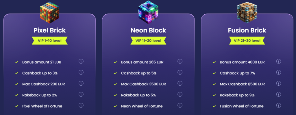 Pixel Brick | VIP 1–10 | 21 EUR | Up to 3% | 200 EUR | Up to 2% | Pixel Wheel of Fortune |