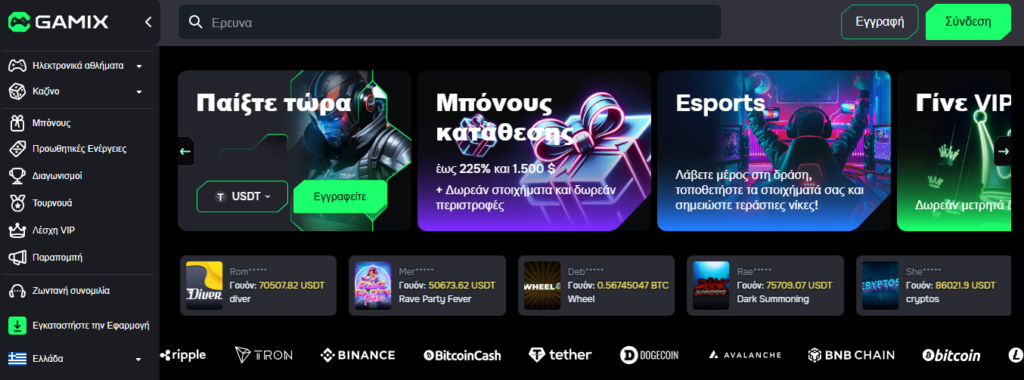 Το Gamix.vip Casino ιδρύθηκε το 2023 και λειτουργεί με άδεια από την Κόστα Ρίκα. Εστιάζει στις συναλλαγές με κρυπτονομίσματα, υποστηρίζοντας Bitcoin, Ethereum, Litecoin, μεταξύ άλλων. Για νέους παίκτες, προσφέρει ένα πακέτο καλωσορίσματος που περιλαμβάνει μπόνους και δωρεάν περιστροφές στις τρεις πρώτες καταθέσεις. Επιπλέον, διαθέτει πρόγραμμα VIP με 15 επίπεδα, παρέχοντας ανταμοιβές όπως επιστροφή χρημάτων και rakeback. Η βιβλιοθήκη παιχνιδιών του περιλαμβάνει κουλοχέρηδες, παιχνίδια με ζωντανούς ντίλερ και πάνω από 60 e-sports, συνεργαζόμενο με περισσότερους από 55 παρόχους λογισμικού. Χάρη στη φιλική διαδικασία εγγραφής και στις ανώνυμες πληρωμές με crypto, αποτελεί ιδανική επιλογή για όσους αναζητούν online καζίνο χωρίς έγγραφα, με ταχύτατες αναλήψεις και απόλυτη προστασία προσωπικών δεδομένων.