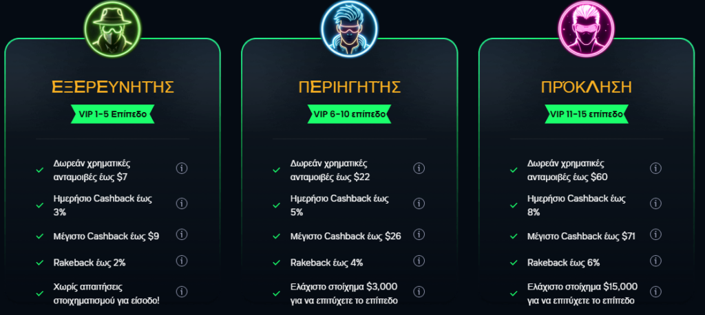 VIP Επίπεδο | Δωρεάν Χρηματικές Ανταμοιβές | Ημερήσιο Cashback | Μέγιστο Cashback | Rakeback | Ελάχιστο Στοίχημα για Επίπεδο |