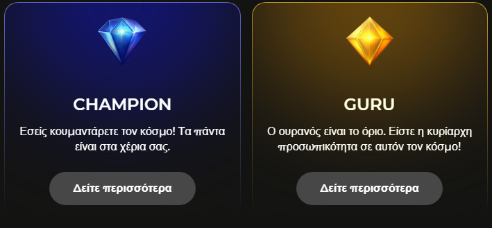 Το Spinstar.bet Casino προσφέρει ένα καλοσχεδιασμένο πρόγραμμα VIP που ανταμείβει τους πιστούς παίκτες με αποκλειστικά προνόμια, επιβραβεύσεις και αναβαθμίσεις στα επίπεδα VIP. Όσο περισσότερο παίζετε, τόσο ανεβαίνετε στη δομή του προγράμματος, απολαμβάνοντας καλύτερες ανταμοιβές, προσωπική εξυπηρέτηση και μοναδικά οφέλη. Οι παίκτες ξεκινούν από το επίπεδο Discoverer και μπορούν να φτάσουν έως το κορυφαίο επίπεδο Guru. Παρακάτω παρουσιάζεται ο πίνακας με τα επίπεδα VIP όπως φαίνονται στην επίσημη ιστοσελίδα του Spinstar.bet: