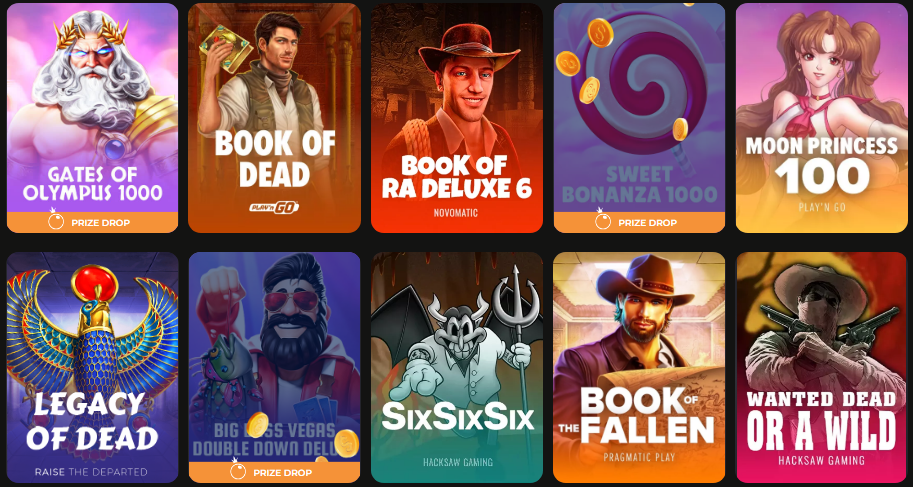 - Κουλοχέρηδες (Slots): Παραδοσιακοί και σύγχρονοι κουλοχέρηδες, με δημοφιλείς τίτλους όπως Book of Dead, Sweet Bonanza, Gates of Olympus και πολλά ακόμη.