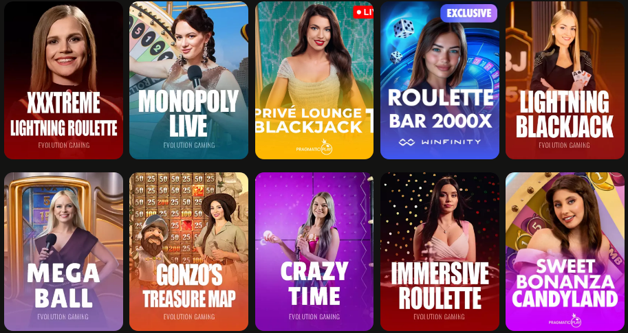 - Live Casino: Παιχνίδια με πραγματικούς ντίλερ από παρόχους όπως Evolution και Ezugi, όπως Lightning Roulette, Crazy Time, Live Blackjack και Monopoly Live.