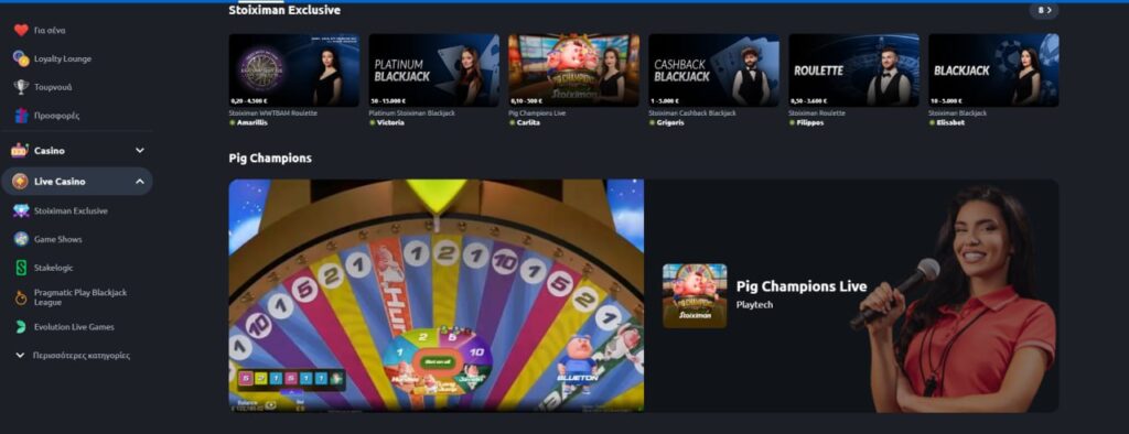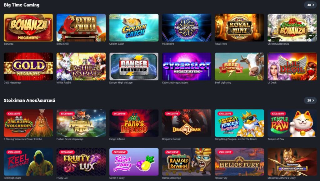 Το Stoiximan Casino προσφέρει μια ευρεία γκάμα παιχνιδιών, συμπεριλαμβανομένων κουλοχέρηδων, επιτραπέζιων παιχνιδιών, ζωντανών καζίνο, τζάκποτ και αποκλειστικών τίτλων.